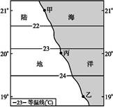4、单选题 气温的日变化一般表现为最高值出现在14时左右,最低值出现在日出前后。下图示意某区域某日某时刻的等温线分布,该日丙地的正午太阳高度达一年中最大值。读图回答该日( )