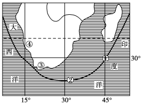 3、单选题 下图为某区域海上航线示意图。在一艘驶往大西洋的轮船上,船员在图中①处看到了海上日出景观,此时为世界时(中时区区时)4时。读图回答下列问题。