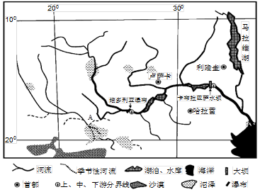 1、综合题 材料一:下图为“赞比西河水系分布和该流域内的一些地理要素”示意图。(22分)
