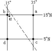 5、单选题 读下图所示经纬网(四点围成一个正方形,虚线代表晨线,角α达到一年中最大),回答下列问题。