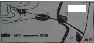 1.河流对城市区位的影响很大,图中四城市相对处于不利区位的是2.受地形、河流等条件影响.下列城市与B城市形态最接近的是3.若图中铁路线为京九铁路线,则与C城市区位最接近的是