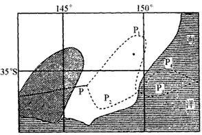 3、综合题  ? 下图为某地区海陆分布图,曲线P表示一月份某大陆局部地区和临海20°C等温线分布,虚线是有待确定的等温线走向,阴影区域为该国主要农业区。读图回答下列问题。