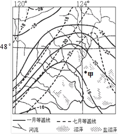 参考答案: (1)夏季,气温普遍较高;南北温差小;气温大致自东南向西北递减。 冬季,普遍低温;南北温差较大;(同纬度地区)中部气温较高,东西两侧气温较低。(夏季冬季任答2点,每点2分)年较差由南向北增大。(2分) (2)以平原为主,(2分)地势大致西北高,东南低。 (2分) 理由:1、根据等温线的分布,说明有西北部有东北—西南走向的山脉分布。? 2、图中东部沼泽广布,说明甲所在的地区地势低平。 3、根据河流的流向。 4、根据经纬度判读,西部山脉为大兴安岭。(任答两点就4分) (3)温带季风气候,降水年际和季节变化大;长时期降水偏少、气温偏高,易引发旱灾;降水集中且强度较大;在地势低平、排水不畅的地区,则易引发洪涝灾害。(每点2分)