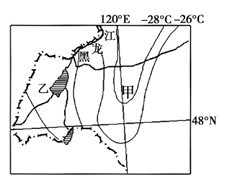 小题1:甲地区等温线向南凸出的原因是 A.太阳辐射影响 B.大气环流影响 C.地形影响 D.人类活动影响