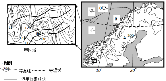 小题1:读图,根据图中等高线分布,可以判断图示区域地形A半岛地势西高东低,A错。A半岛西坡是迎风坡,降雪多,东坡是背风坡,降雪较少,所以雪线西坡低,东坡高,B错。随着全球变暖,气温升高,B处东侧山脉的积雪冰川融水多,注入B处海洋,导致水温降低,C对。B处等温线凸向高纬地区,是受沿岸暖流影响的结果,与季节无关,D错。