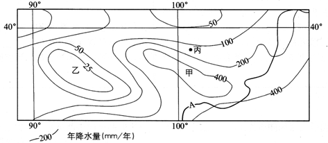 小题2:根据甲、乙、丙三地所在的经纬度位置及降水量特征进行判断。甲处降水量大,位于祁连山脉的迎风坡;乙处降水量少,是高原盆地柴达木盆地;丙处位于祁连山北麓,为河西走廊。所以本题选择B选项。
