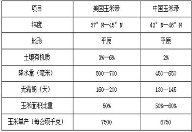 (4)下表为美国和我国东北部玉米带的比较,从表中可以看出,美国玉米带的单产高于我国玉米带,其原因是: