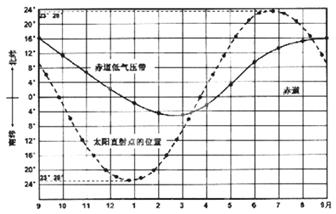5、单选题 该图表示一年中太阳直射点与赤道低气压带的位置变化。赤道低气压带位置的变化