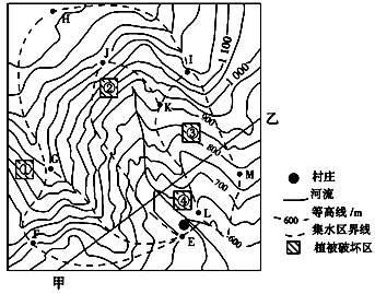 【小题1】上图中①—④若为植被破坏同等严重地区,且面积和土质状况基本相同。据此推测,暴雨发生时,会影响该村庄且泥、石等物质产生量最多的可能是( )。