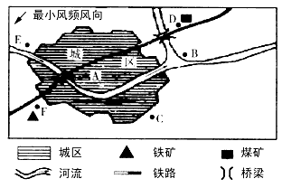 5、综合题 ? 下图为某城镇地图,该城镇规划现拟建钢铁厂、造纸厂、自来水厂、啤酒厂和服装厂,但由于条件的限制,所以每个厂只能在图中A、B、C、D、E、F各地点中选择。请你帮助该城镇完成以上厂区的布局并说明理由。