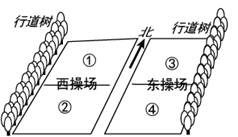 1、单选题 该图为我省平原地区某中学的操场和行道树示意图(晴天8:00前后,东操场大部分被行道树的树荫覆盖)。完成问题。