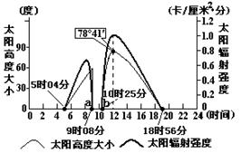 1、单选题 下图为我国某城市夏至日时太阳高度大小与太阳辐射强度曲线图。太阳辐射强度是指在单位面积上,单位时间内获得的太阳辐射能量。据此回答7—8题。