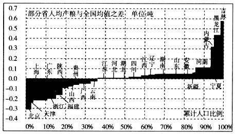 4、单选题 《全国土地利用总体规划纲要》提出,要坚守18亿亩(1亩≈0.067公顷)耕地红线,到2010年和2020年,全国耕地应分别保持在18.18亿亩和18.05亿亩。这一红线是中国粮食安全的警戒线,保障耕地面积是铺设粮食安全之路的第一块巨大基石。我国83个50万人口以上的大中城市中,有73个分布在全国52片耕地集中分布区,即我国最强劲的经济发展区域与最需要保护的集中连片优质耕地分布区域在空间上是复合的。下图为“我国部分省区人均产粮与全国均值之差”示意图,根据图文资料,回答1~3题。