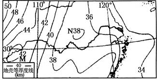2、单选题 读“我国大陆部分地壳等厚度线图”,完成下列各问题。