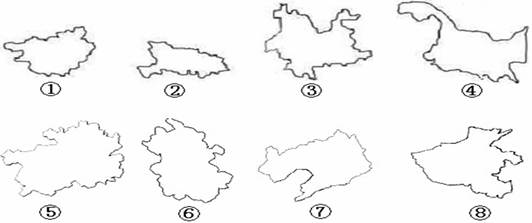 5、单选题  下面我国八个省级行政区的轮廓图,其中简称为黔和省会在合肥的分别是: (? )