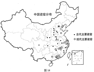 2、综合题 材料一?瓷器是高岭土(矿物)经过加工成型,再经高温烧制而成。图14示意为中国古代与现代陶瓷主要生产地分布。