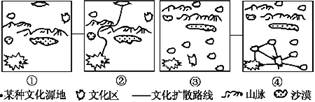 本题解析:命题意图:考查迁移扩散的意义和古代迁移扩散与地形障碍的关 本组题主要考查对文化扩散形式的理解与应用。从图中可知①~②的文化迁移跨越了各种自然障碍,迁移距离遥远,因此,该文化扩散类型为迁移扩散,在图中表现为新文化区与文化源地不相连,第1小题中 A选项为迁移扩散,B为传染扩散,C为等级扩散,D为传染扩散。第2小题中,③~④两文化区之间距离小,应属于文化扩散类型中的扩展扩散,文化扩散必须有载体,其载体最初是人,后来媒体也起了重要作用。