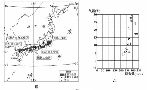 材料一:甲图为亚洲部分地区图,乙图为北九州气温与降水统计图