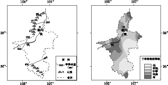【小题2】从左右两图对比可以看出,干旱分布和降水分布并不完全一致,如南部降水较多,而干旱等级也较高;该地区总体较为干旱,黄河沿岸水源充足,灌溉农业发达,更易受到干旱影响,干旱危害度高;而中东部地区为草原区,对干旱的承受能力较强。