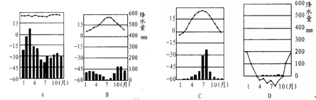 (1)比较A、D两种气候类型在分布地区上的差异。(4分) (2)简述B气候的类型、特征及主要分布地区。(6分) (3)C是?气候,在我国位于秦岭—淮河以?(南或北)。(4分)