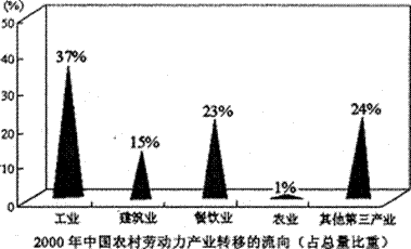 ?(1)结合上图,简述2000年中国农村劳动力产业转移的流向特征。(2分)