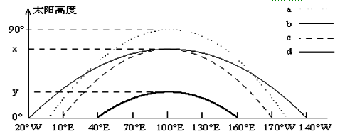 5、单选题 图为某日a、b、c、d四条纬线上太阳高度随经度的变化图。读图完成下题。