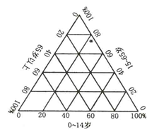 本题解析:1.本题考查地理图表的判读能力。三角坐标图0—14岁人口的比重平移65岁以上轴读数为23%。所以本题选择D选项。