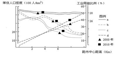 4、单选题 读我国东部某城市常住人口密度、土地价格、工业用地比例、7月平均气温时空变化示意图,回答下题。