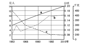 1.右图中a、b、c三根折线依次表示2.与1953年比,2015年我国单位面积的产量的变化特点是3.单位面积的产量呈现上述这样变化,与之相关的因素是
