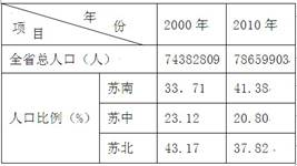 3、单选题 下表为据第五次和第六次全国人口普查数据统计的江苏省总人口及三大区域人口占全省人口比例,图为江苏省2000年和2010年人口年龄结构图。回答题。