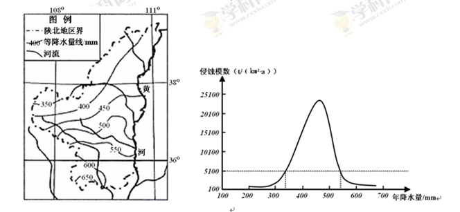 材料一?陕北地区平均年降水量分布图(左图)及自然状态下年降水量与土壤侵蚀关系图(右图)。