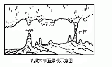 参考答案:B 本题解析:沙丘地貌的形成是风力的沉积作用所形成的,故A错误;C选项本身的叙述正确,但与题干不符,D选项应该属于流水的下切侵蚀作用形成冲沟。。 本题难度:一般 2、单选题 读“某洞穴剖面景观示意图”,完成1~2题。