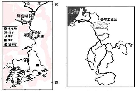 (3)请列举湘江流域“长沙-株洲-湘潭”经济圈和莱茵河流域鲁尔工业区发展工业的共同有利条件?(3分)