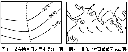 (2)图甲虚线所示的洋流朝 (方向)流动。在图乙所示的①、②、③、④四海区中,图甲表示的海域可能出现在 海区。