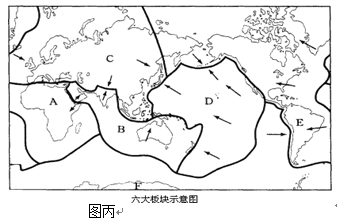 (4)根据板块构造图,结合所学的大陆、大洋分布的知识,可以判断B是印度洋板块 , E是美洲板块。