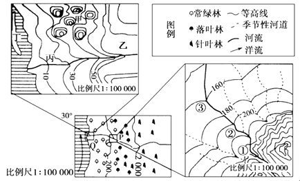 【小题1】读图,根据放大图分析,P处地貌位于河流出山口处,是冲积扇地貌,B对。河漫滩是河流两岸或河口附近的平原地区,A错。三角洲位于河流入海口, 错。侵蚀平原出现在山地,不是在河流出山口,D错。
