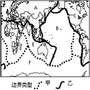 (1)板块边界类型有生长边界和消亡边界。甲属于生长边界,乙属于消亡边界。