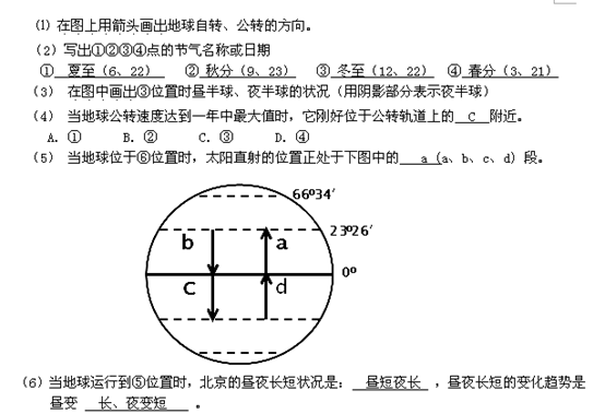 ⑴ 在图上用箭头画出地球自转、公转的方向。