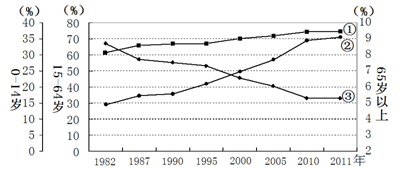 小题1:图中①②③三条曲线按照年龄0-14岁、15-64岁及65岁及以上划分,依次是
