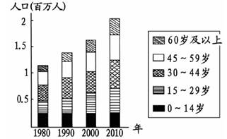 3、单选题  通常将人口按照0-14岁、15-64岁及65岁及以上分为三个年龄段进行统计分析。下图是我国不同时期三个年龄段人口统计图,据此回答下列问题。