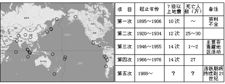 材料1:本世纪以来全球≧8级的地震分布图 材料2:20世纪中国大陆5次地震活跃期统计