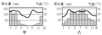 材料二: 图中甲、乙两地气温曲线、降水柱状分布图