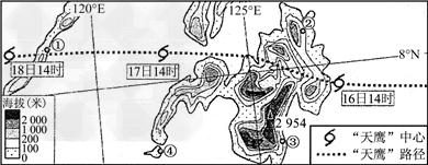 4、单选题 2011年12月台风“天鹰”经过图示地区,并造成强降水。读“天鹰移动路径示意图”,回答1~2题。