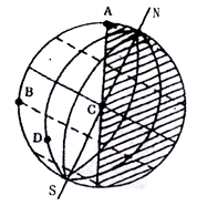 3、单选题 该图是北半球局部日照图,AB为晨昏线,纬线BC弧度为90?。图示区域恰好全部为8日。读图回答问题。