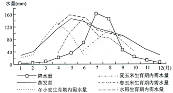 4、单选题 读我国某地多年月平均降水量、蒸发量与各作物生育期内平均需水量关系图,回