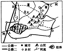 (1)该地区A,B两城市之间建有两条公路,分别是国道和地方性公路,据公路建设一般原则判断:公路 ? 一是__________________。 (2)根据图中信息,判断A,B,C,D四个小城市中,最先发展成为中等城市的是_______。 (3)该地区计划在B和D城市之间建设一条新的地方性公路,现有三个方案,_______较合理。 (4)该地区有两个天然水系——大青河与小青河,两河均可通航,为了充分发挥水运的潜力,可以修建 ?_______来形成本地区的统一内河运输网,如果对该工程进行论证,从运输量和建设工程量两个方面 ? 来考虑,在小青河上对P、Q两地进行比较,你认为选择建在_______较为合理。