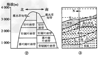(3)①山地中南坡的森林植被比北坡分布广泛的主要原因是 ?,①~④中森林分布状况与此原因相同的还有?。