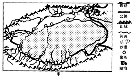 5、单选题 塔里木盆地的四周是由冰雪融水补给的河流冲积而成的冲积扇,绿洲就在冲积扇的中下部。这些地区人口集中,农牧业较为发达,交通便捷。下图图甲为塔里木盆地城镇分布示意图,图乙为该区域某处地形剖面图。据此回答1~2题。