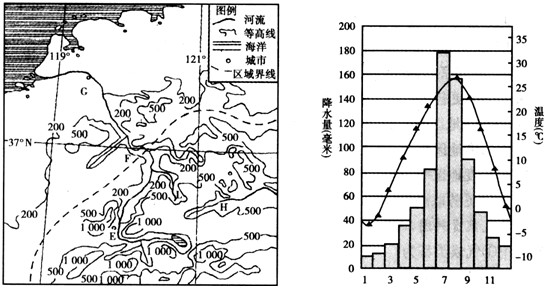 4、综合题 下图为山东半岛某区域示意图及该地区月平均气温、降水资料图。读图回答下列问题。