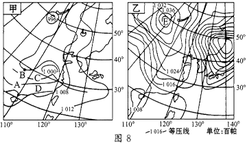 2、综合题 甲、乙两图分别为同一地区不同时间的等压线示意图,读图完成下列各题。(16分)
